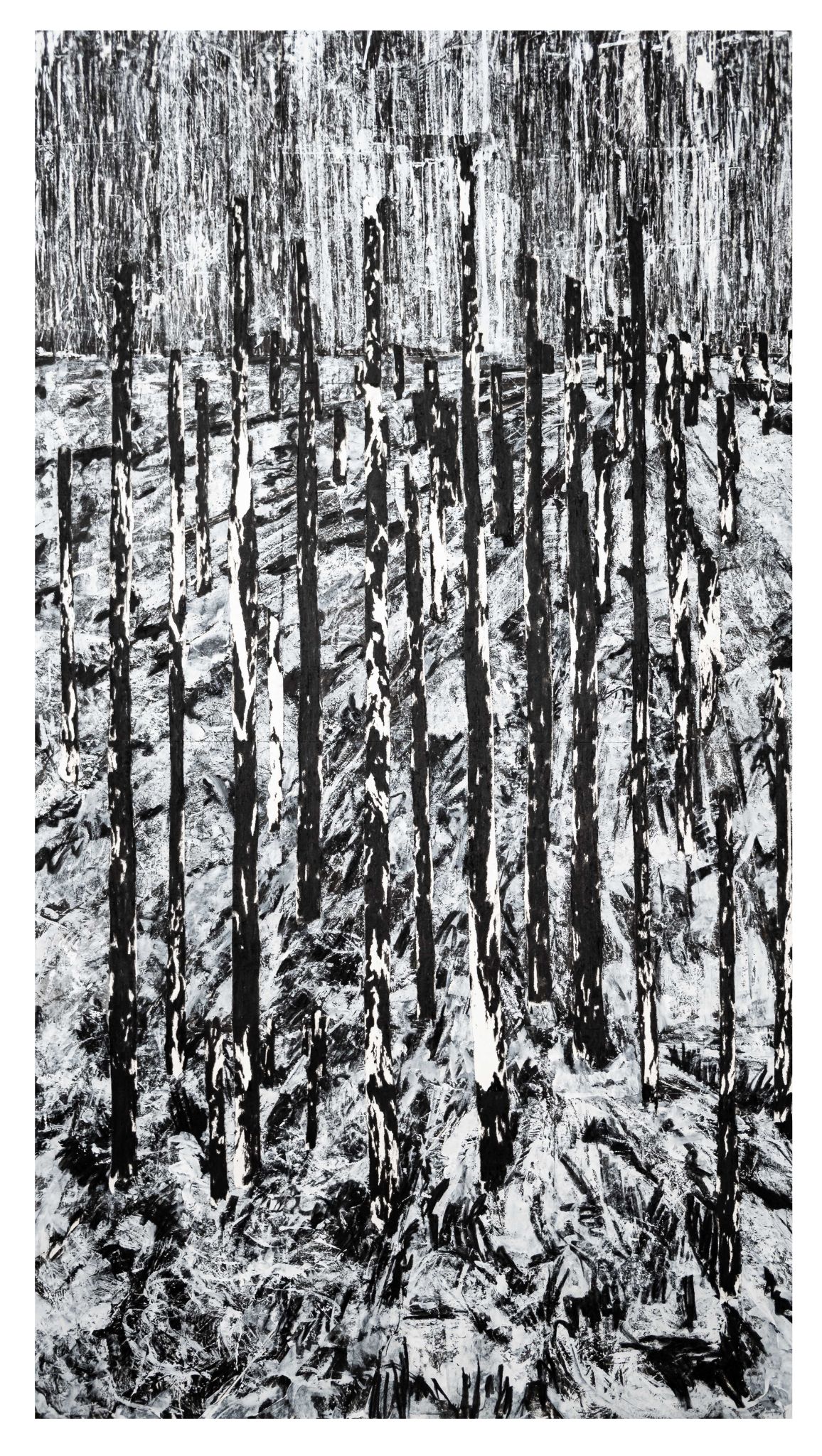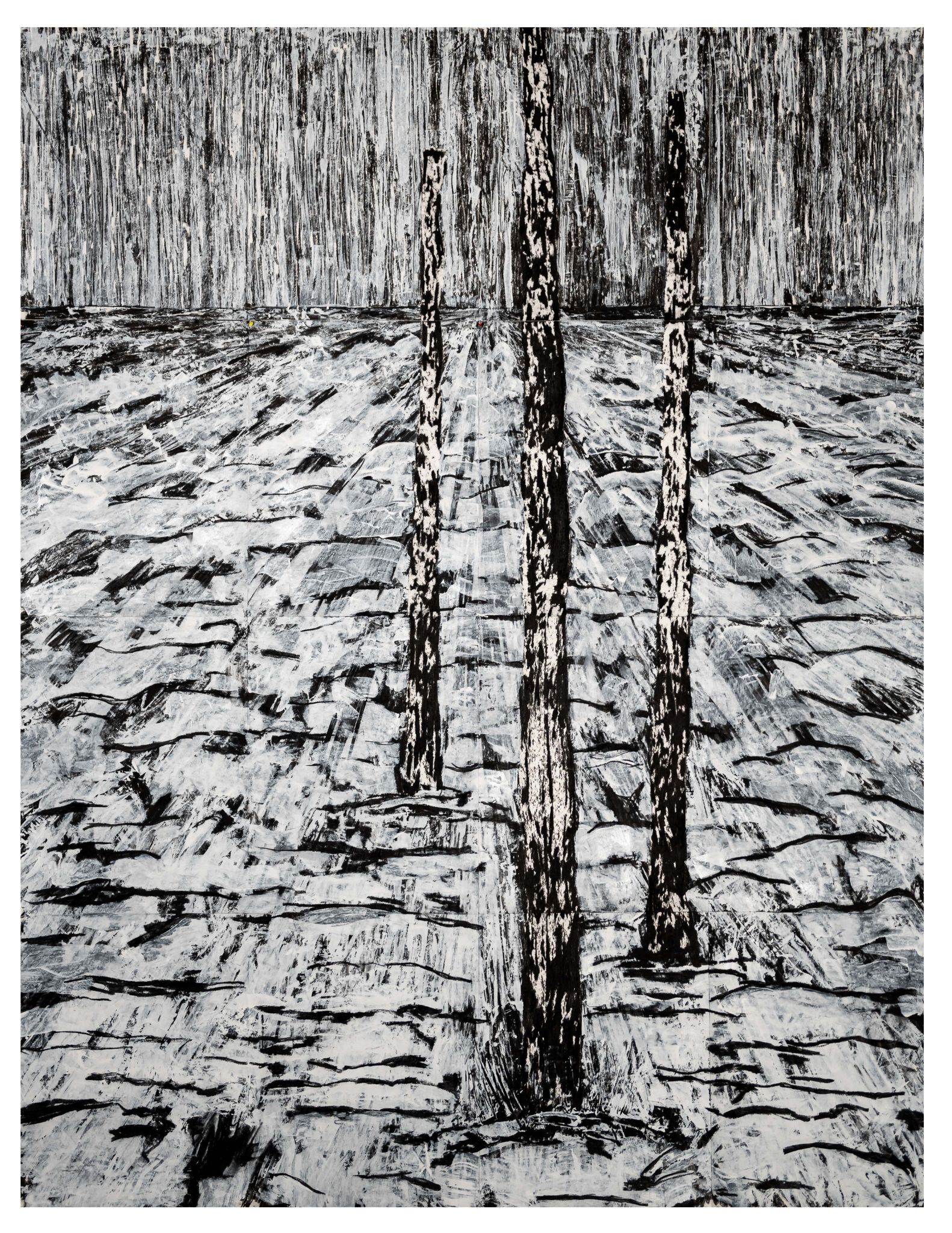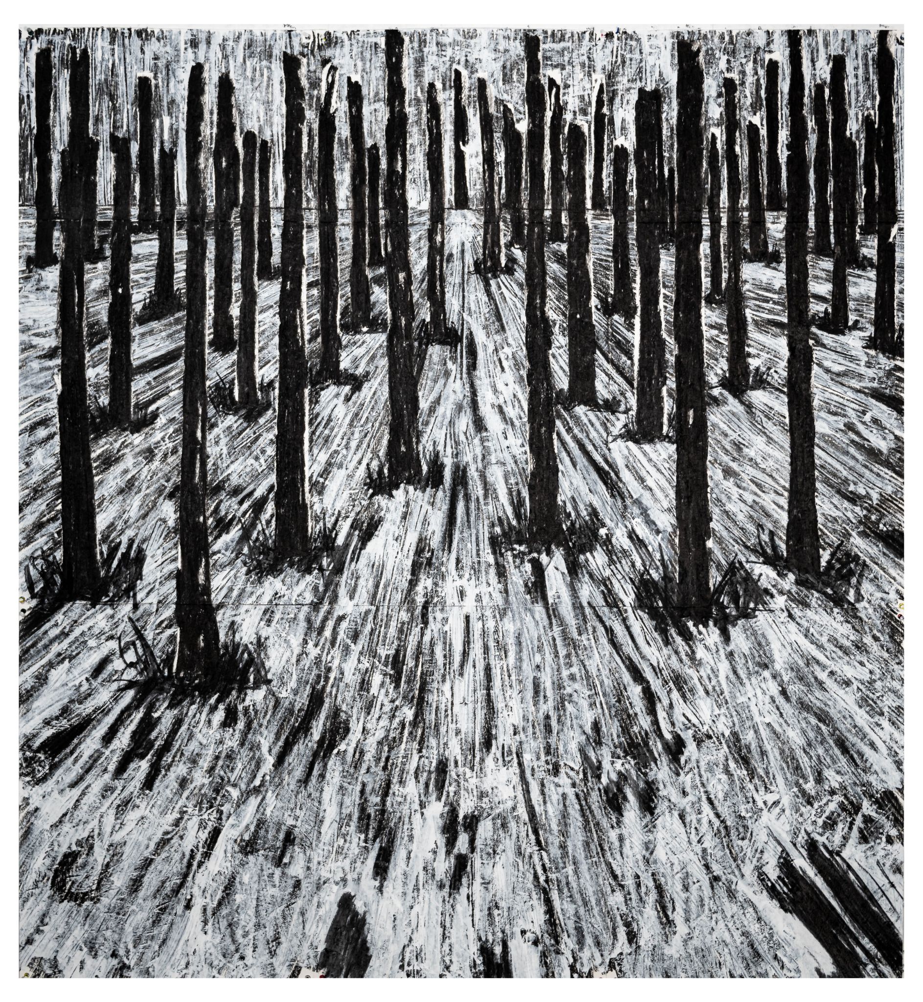 «Bosques Negros» es una serie que nos introduce en paisajes donde el tiempo parece haberse detenido, un espacio sombrío e inhabitado que resuena con las profundidades de la psique humana. Cada obra nos lleva a un bosque cubierto de hielo, un «no lugar» donde la naturaleza no acoge, sino que confronta. Estos entornos se convierten en un espejo de nuestra desolación, angustia y fragilidad existencial.